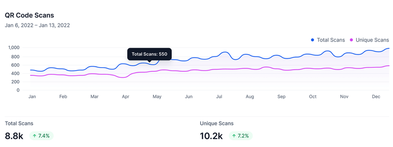 Track total and unique QR scans over time, view performance by QR type, and filter data by date - all in real-time